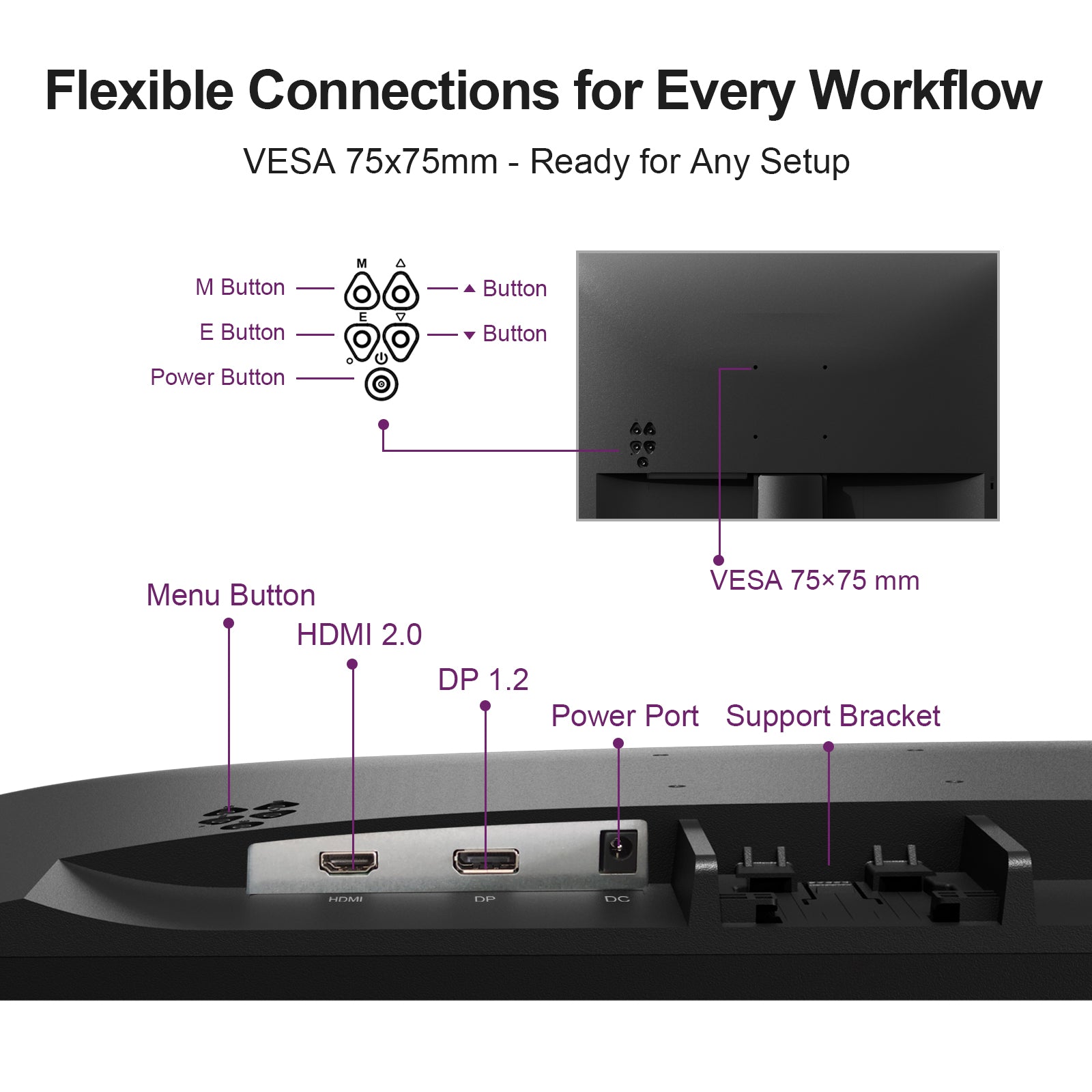 【Flexible Setup】Square base for stability, tilt adjustment, and 75x75mm VESA mount allow this 24-inch Full HD monitor to adapt to your needs. (Please note: this model does not include built-in speakers)